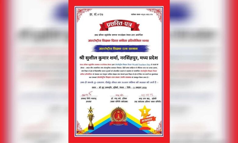 अंतर्राष्ट्रीय शिक्षक दिवस पर गाडरवारा के सुशील शर्मा को मिला ‘अंतर्राष्ट्रीय शिक्षक रत्न’ सम्मान