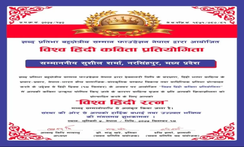 गाडरवारा, 14 सितंबर। मध्य प्रदेश के नरसिंहपुर जिले में ख्याति प्राप्त साहित्यकार एवं वरिष्ठ कवि एवं साहित्यकार सुशील शर्मा को हिंदी दिवस के अवसर पर सम्मानित किया गया है। नेपाल की प्रसिद्ध संस्था शब्द प्रतिभा बहुक्षेत्रीय सम्मान फाउन्डेशन नेपाल द्वारा हिंदी दिवस के संदर्भ में आयोजित विश्व हिंदी कविता प्रतियोगिता में उत्कृष्ट कविता के आधार पर सुशील शर्मा को ‘विश्व हिंदी रत्न मानद उपाधि सम्मान’ से प्रशस्ति पत्र एवं सर्टिफिकेट प्रदान कर सम्मानित किया गया। नेपाल में राजनीतिक अस्थिरता के कारण यह सम्मान उन्हें ऑनलाइन प्रदान किया गया।