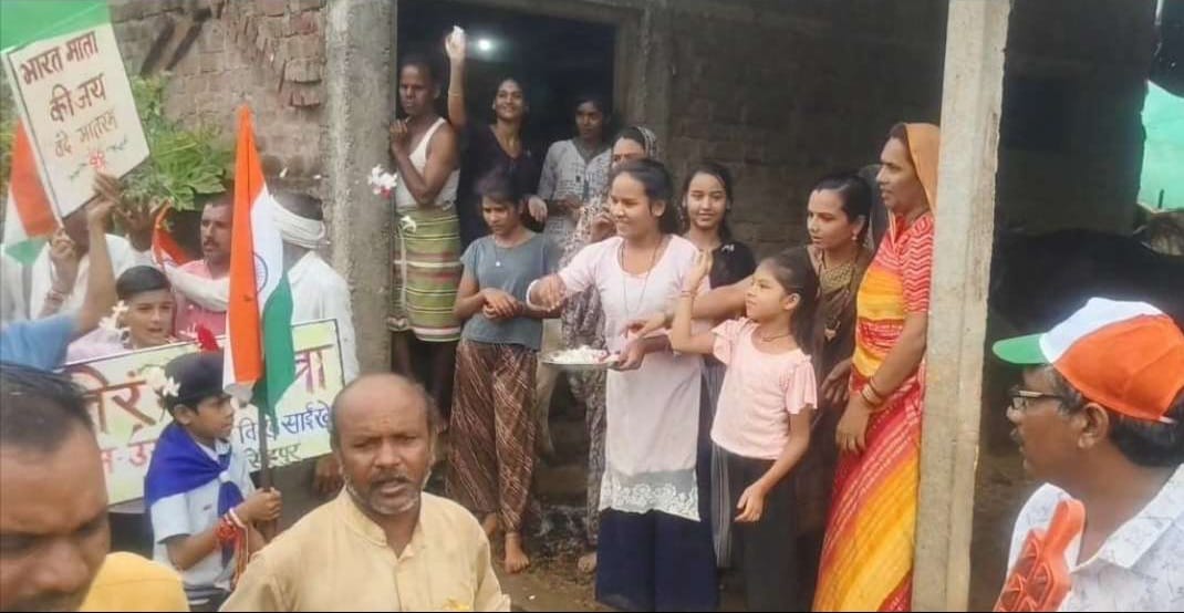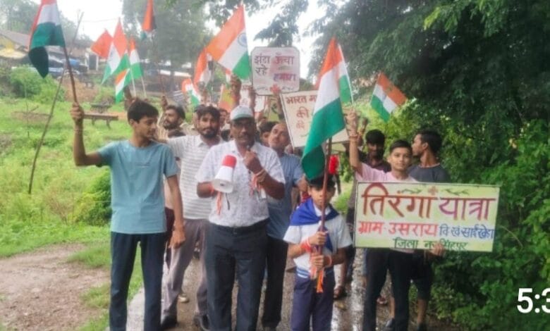 सालीचौका नरसिंहपुर- गत दिवस साईंखेड़ा ब्लाक के अंतर्गत ग्राम उसराय में अनोखी देश भक्ति देखने मिली। इस गांव में पदस्थ प्राथमिक विद्यालय के शिक्षक हल्के वीर पटेल एवं प्रधानपाठक राममनोहर चडार के आव्हान पर शासन के निर्देशानुसार तिरंगा यात्रा निकाली गई। यात्रा में स्कूल के स्काउट गाइड के बच्चों के हाथों में राष्ट्रीय ध्वज था। संपूर्ण गांव के घर-घर से महिलाओं ने तिरंगा यात्रा में अपने – अपने घर के द्वारों एवं छतों से पुष्पों की वर्षा करते हुए तिरंगा झंडा के सम्मान में जय घोष किनारे लगाए। देश भक्ति का माहौल ऐसा बना कि क्या बच्चे ,क्या जवान और क्या बूढ़े सभी ने अपने हाथों में राष्ट्रीय ध्वज तिरंगा झंडा लेकर गांव की गलियों – गलियों से ढोल नगाड़े और मजीरों के साथ पूरे जोश और उत्साह पूर्वक निकलते हुए तिरंगा रैली निकाली ।