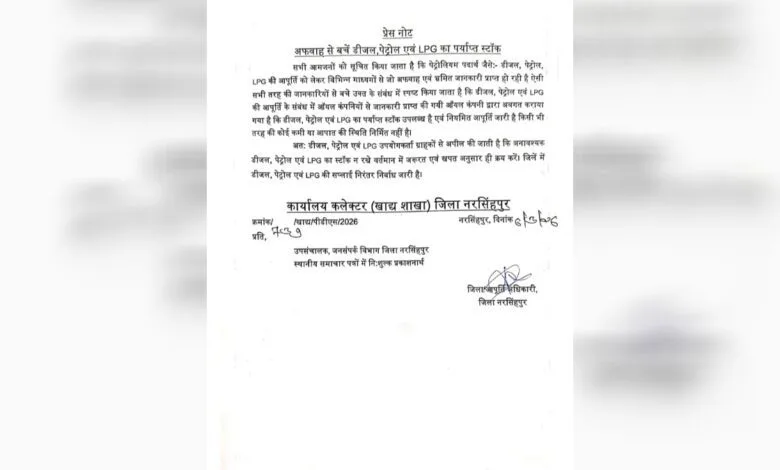 नरसिंहपुर में पेट्रोल-डीजल और LPG की कमी की अफवाह झूठी, प्रशासन ने कहा – पर्याप्त स्टॉक उपलब्ध