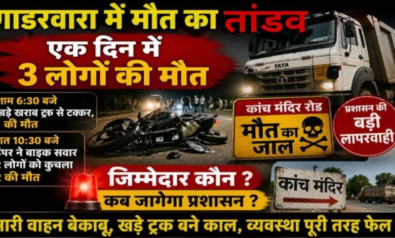 गाडरवारा के कांच मंदिर मार्ग पर एक ही दिन में दो दर्दनाक हादसों में 3 लोगों की मौत। भारी वाहनों, खड़े खराब ट्रकों और प्रशासनिक लापरवाही पर गंभीर सवाल।