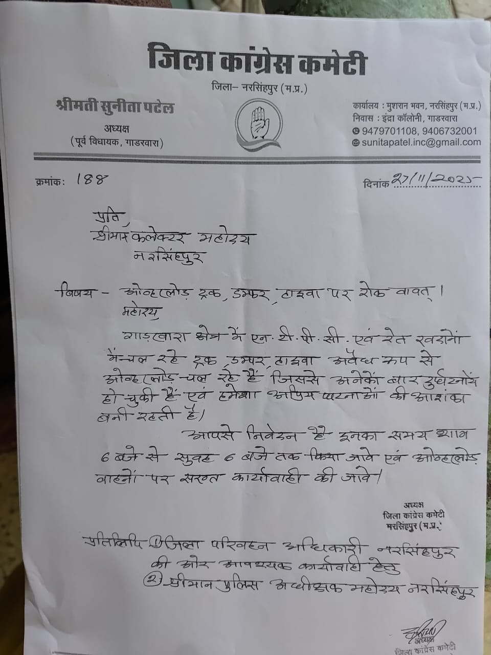 गाडरवारा। जिले में ओवरलोड ट्रक, डंपर और हाइवा के बढ़ते संचालन को लेकर जिला कांग्रेस कमेटी ने प्रशासन से सख्त कार्रवाई की मांग की है। इस संबंध में जिला कांग्रेस अध्यक्ष सुनीता पटेल ने कलेक्टर को ज्ञापन सौंपा।