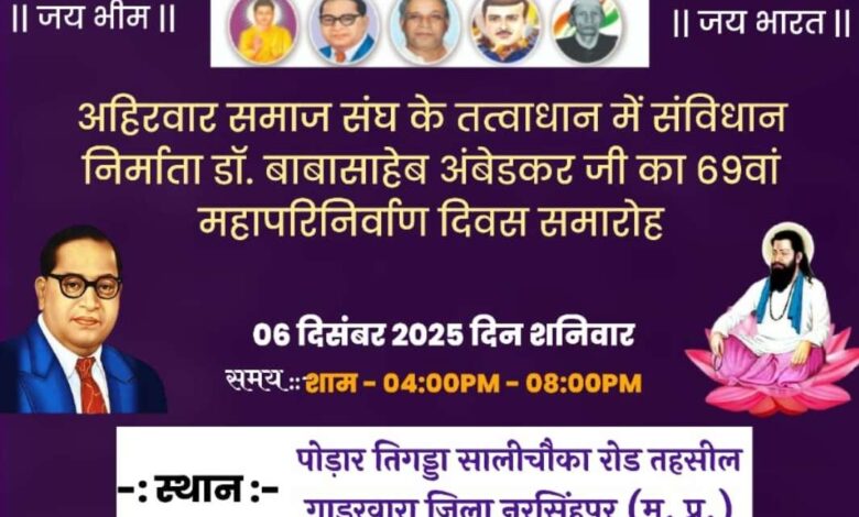 अहिरवार समाज संघ की ओर से संविधान निर्माता डॉ. भीमराव रामजी अम्बेडकर की 69वीं पुण्यतिथि (महापरिनिर्वाण दिवस) पर श्रद्धांजलि सभा का आयोजन किया जाएगा। यह कार्यक्रम 06 दिसम्बर 2025, शनिवार, शाम 4 बजे सालीचौका के पोड़ार तिगड़ा में आयोजित होगा, जिसमें बड़ी संख्या में समाजजन उपस्थित रहेंगे।