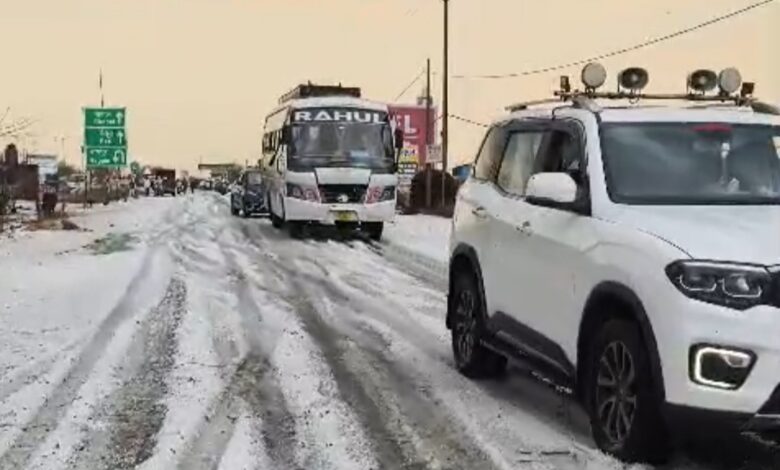 फोरलेन पर बिछी ओलों की सफेद चादर